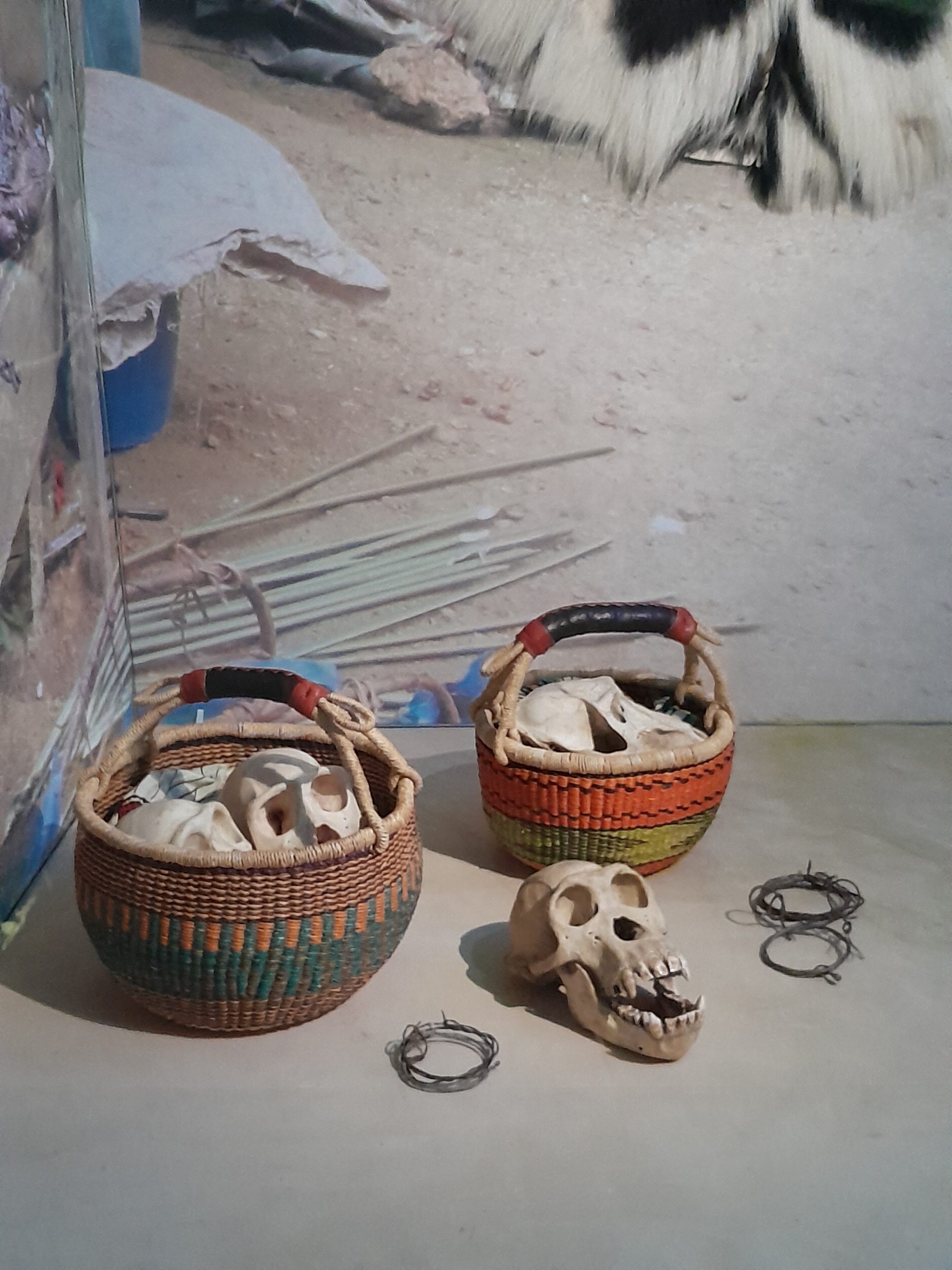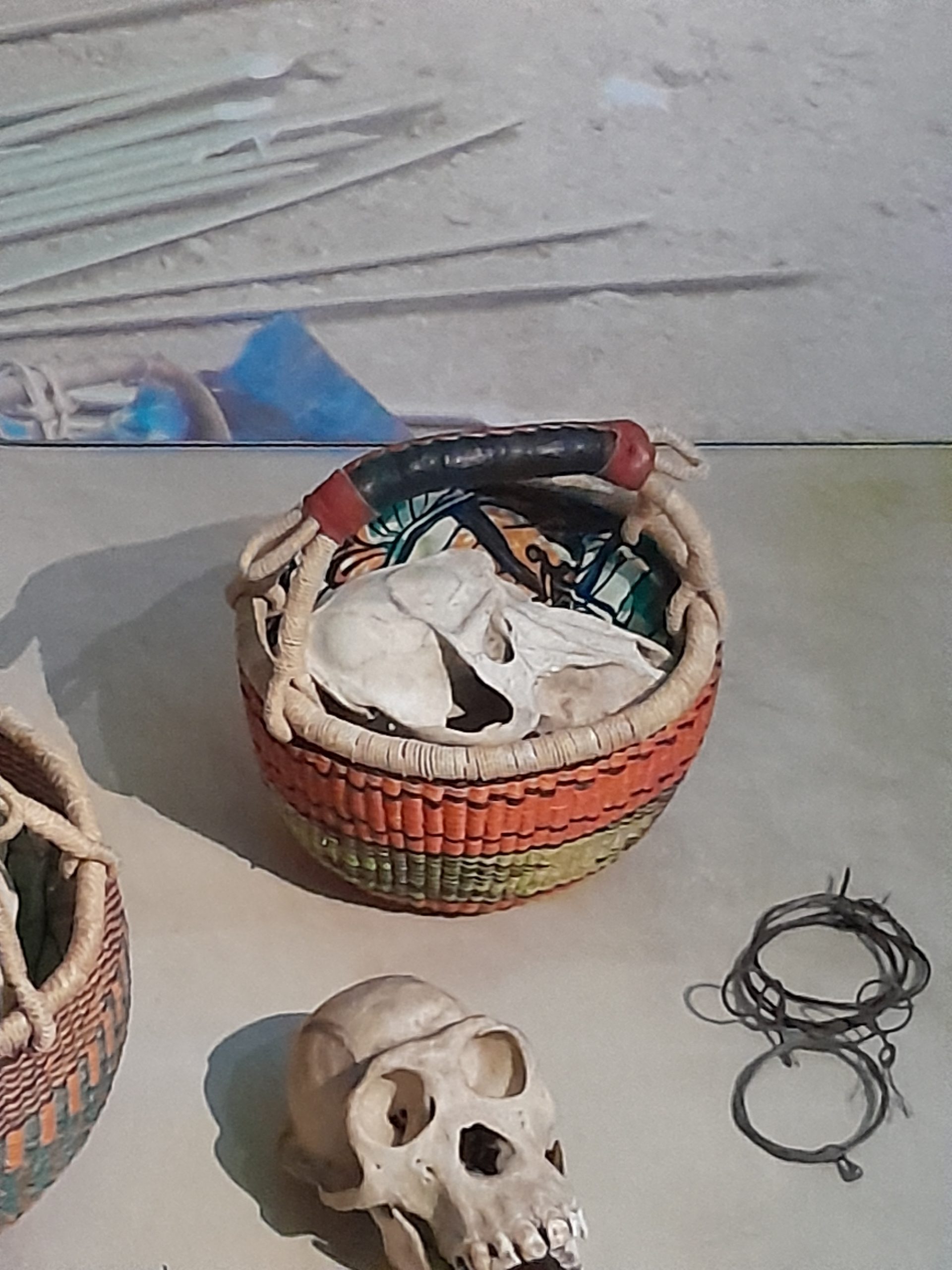 2 no. colourful wicker baskets with handles, currently installed in the Monkeys: Our Primate Family exhibition at the National Museum of Scotland, Chambers Street, Edinburgh. The baskets are currently being used to hold skull specimens in a display resembling a bushmeat market. Please note that the skulls pictured are not available, only the two baskets and fabric inside.