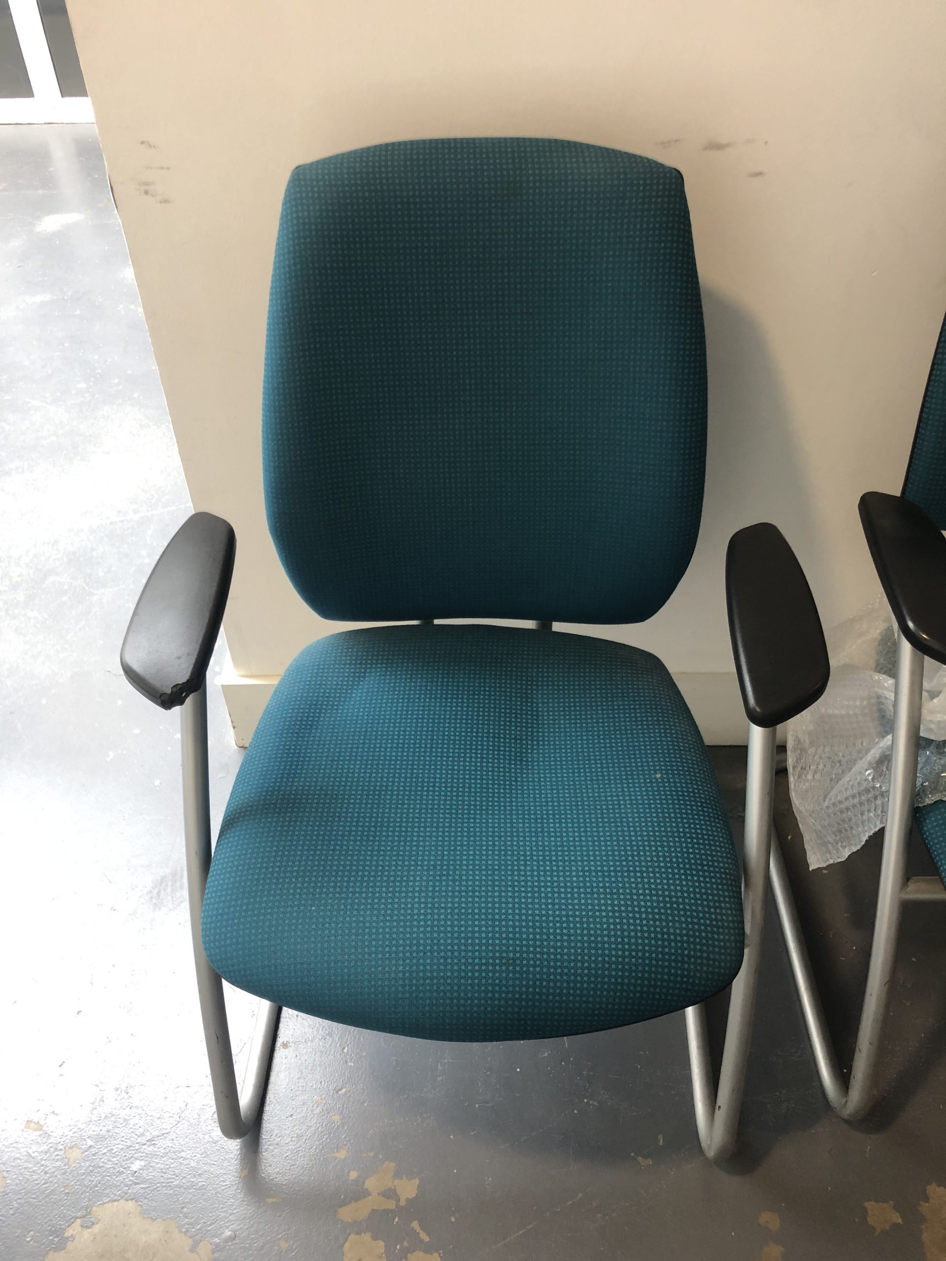 Up to 10 board room chairs available, upholstered in blue-green fabric. These have not been used very much and are comfortable. One chair has some damage to one of the black rubber arm rests and a few have some marks on the fabric.